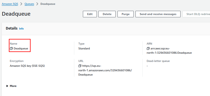 - Go to the SQS console and create another queue (this will act as your dead-letter queue).