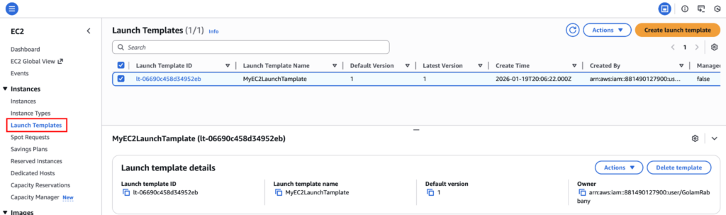 Once everything looks correct, click on “Create launch template”. AWS will automatically create version 1.