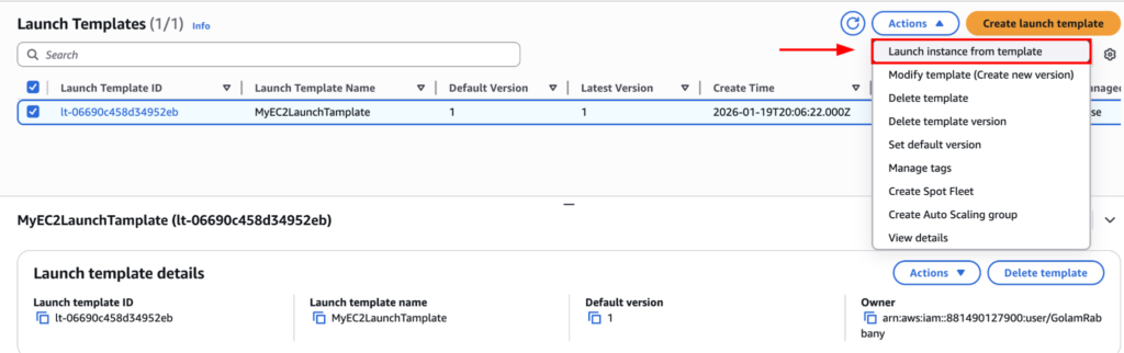 Now let’s create an EC2 Instance using the launch template we have just created. For that select the launch template and click on Actions > Launch instance from template.